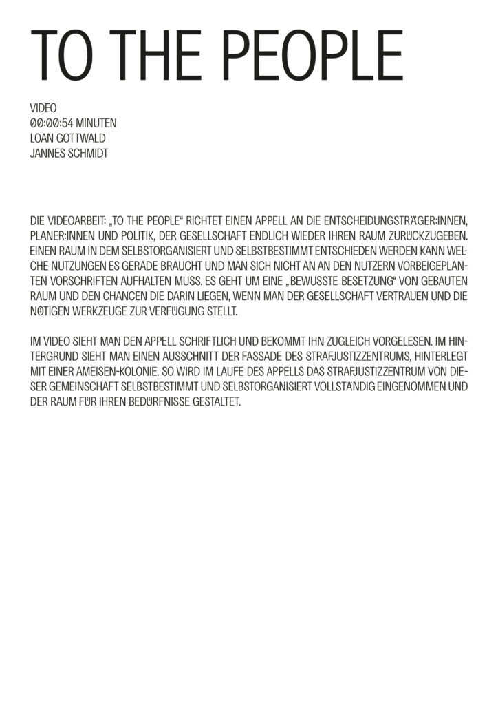 Das Video erzählt von einer Zukunft, in der das Strafjustizzentrum erfolgreich vor dem Abriss gerettet und zu Raum für Wohnen, Arbeiten und Gastronomie umgenutzt wurde. Der Umbau erfolgte mit minimalen baulichen Eingriffen, um die Geschichte des Gebäudes sichtbar zu lassen.