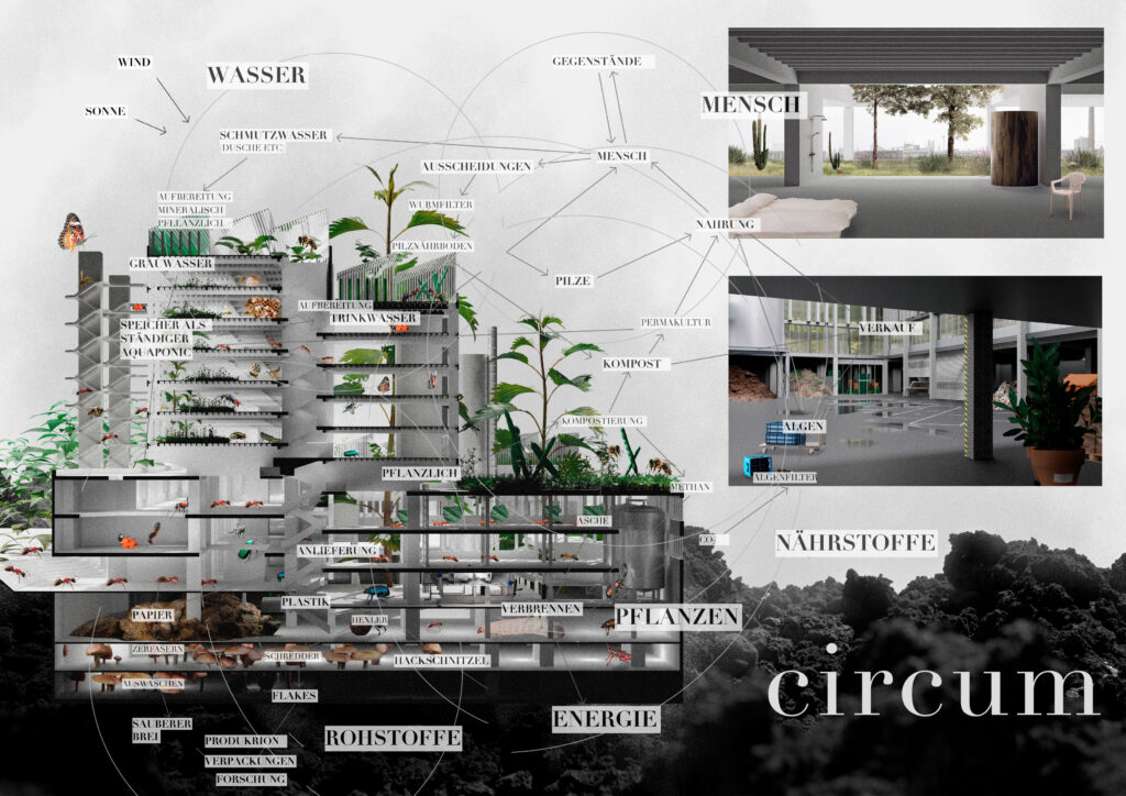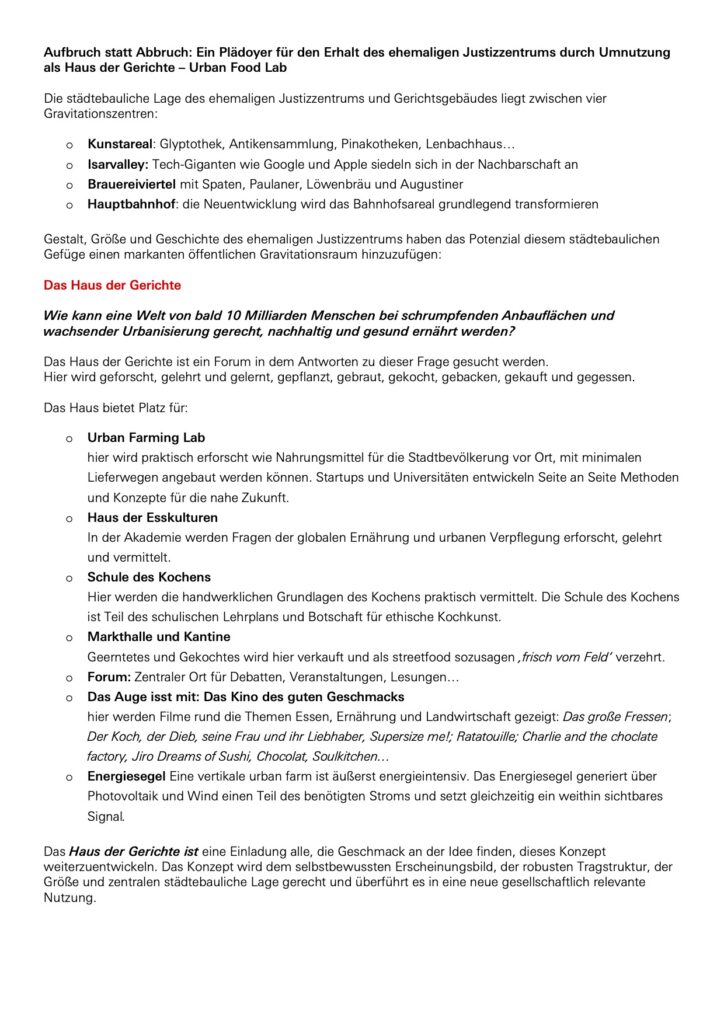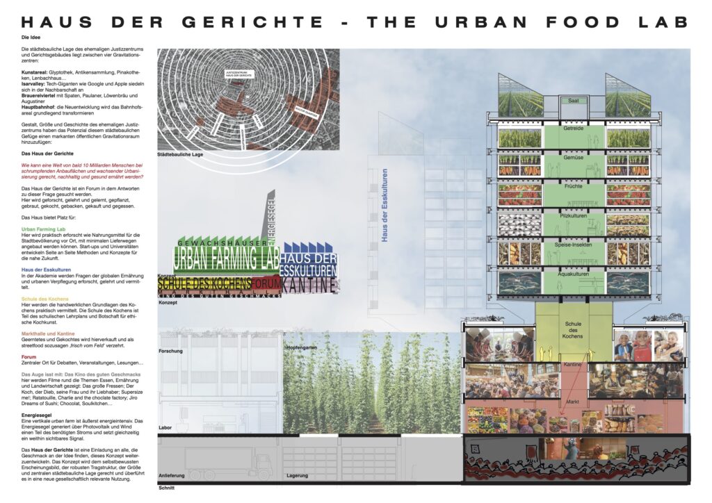 „Essen müssen alle. Doch woher kommen unsere Nahrungsmittel und wie werden sie produziert? Der Zyklus der Nahrung muss uns alle interessieren. In diesem Projekt finden viele neue Ideen der ‚food production‘ Platz und können so anhand des Justizzentrums sichtbar gemacht werden. Der Vorschlag hat das Potential, eine komplette Neudefinition und Sinngebung für dieses Gebäude zu sein.“