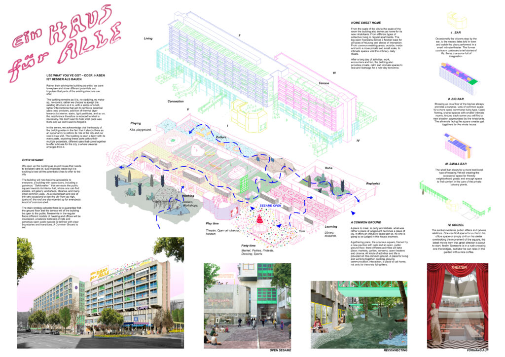 „Der Entwurf eines Hauses für alle – mit einem Anspruch an direkte demokratische Teilhabe, überregionale Vernetzung und für mehr Gestaltungsspielräume der Zivilgesellschaft. So kann ein Ort für Prozesse gemeinsamer Ideenfindung, Organisierung und Gestaltung entstehen, die mit der Politik konkret verhandelt werden sollen. Kulturelle Veranstaltungen, gemeinschaftliche Projekte und experimentelle Wohnformen ergänzen das Konzept und sollen sich an die wandelnden Bedürfnisse einer Stadtgesellschaft anpassen können.“
