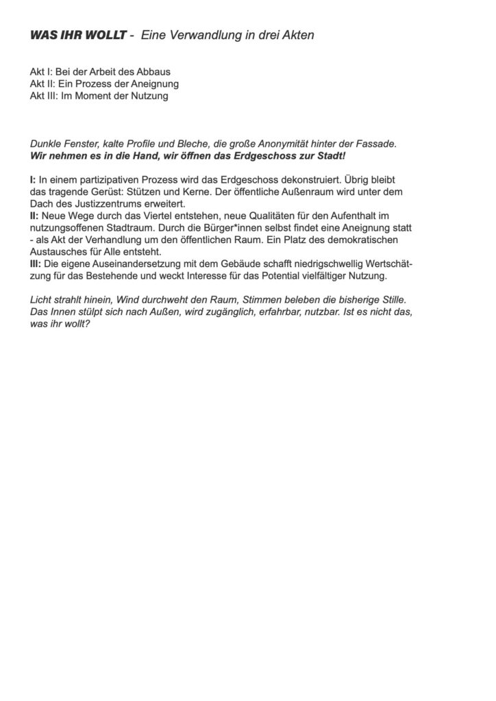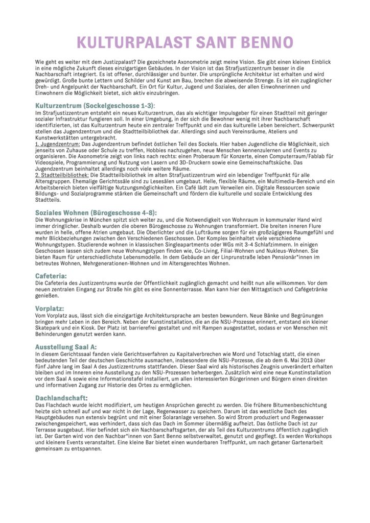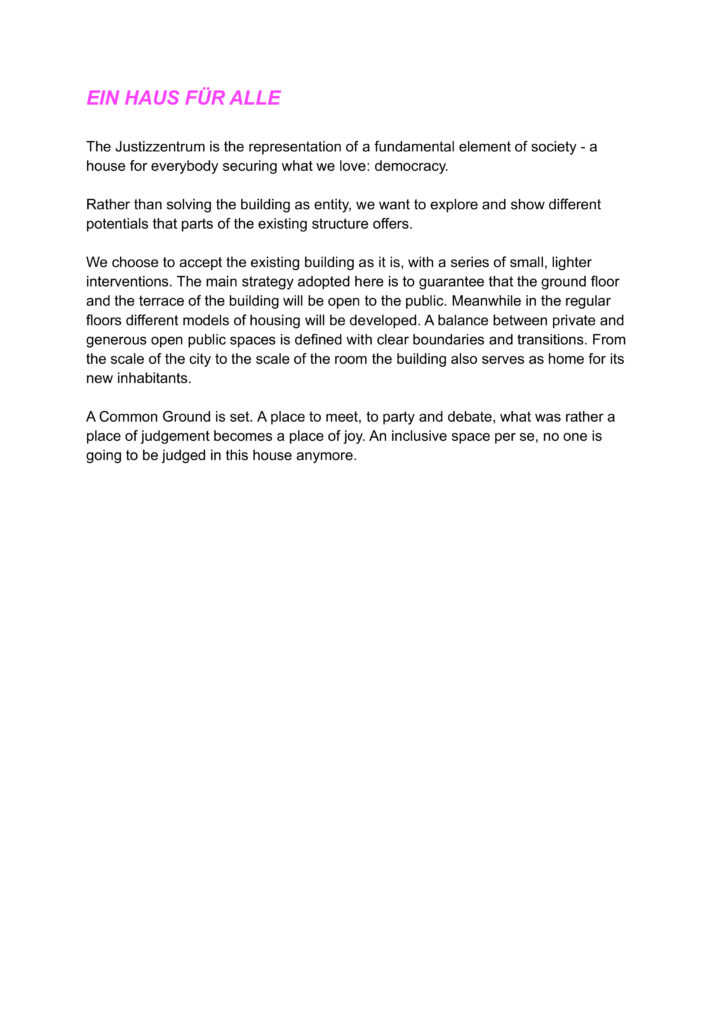 „Das Projekt leitet die Bedarfsabfrage direkt an die Stadtgesellschaft weiter und lässt exemplarisch Stimmen der Münchner*innen laut werden. Sie werden zu Ideengeber*innen und Entscheidungsträger*innen. Soziale Teilhabe wird hier zur Praxis eines Entwurfskonzepts zur Umnutzung des Justizzentrums. Dieses partizipatorische Prinzip kann als Grundlage für ein Ausarbeiten des Bebauungs- und Nutzungskonzept dienen. Wer spricht? Wer entscheidet und wie kann Teilhabe anders zugänglich gemacht werden? Diese Einreichung beleuchtet eben diese Fragen und setzt ein Schlaglicht auf einen demokratischen Prozess in der Entscheidungsfindung.“