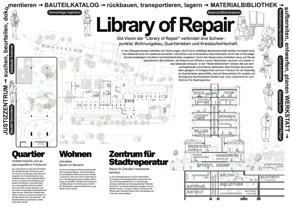 Das ehemalige Justizzentrum wird zum Mittelpunkt einer neuen Handwerks- und Reparaturkultur. Die Library of Repair ist Prototyp für zirkuläres Bauen und Kreislaufwirtschaft in München, bei dem die daraus resultierende Expertise durch Trainings und Workshops weitergegeben wird.