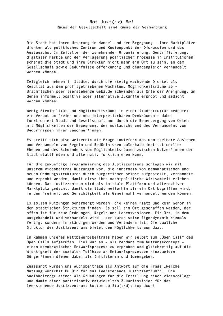„Ein durchdachtes Plädoyer für eine Öffnung des Justizzentrums für alle durch eine subkulturelle Nutzung, mit politischem Anspruch und Weitsicht, die die andauernde Verdrängung durch Zwischennutzungen aufbrechen will. Die Nutzer*innengemeinschaft wird selbst in eine Entscheider*innenrolle gebracht, um Bedürfnisse und Anforderungen an ein solches Zentrum zu sammeln und zu erproben – mit basisdemokratischen Prozessen, prüfendem Blick auf Ökologie und die Notwendigkeit jeweiliger Umbauten. Ziel ist die Selbstverwaltung des Gebäudes durch eine solidarische Stadtgesellschaft, frei von Gewinnabsichten und marktwirtschaftlichen Zwängen. Für Wohnen im Bestand des Justizzentrums sieht die Einreichung viele Hürden durch die bisherige Architektur und dem bestehenden Gebäudeskelett bzw. Infrastruktur gegeben und will deshalb darauf verzichten.“
