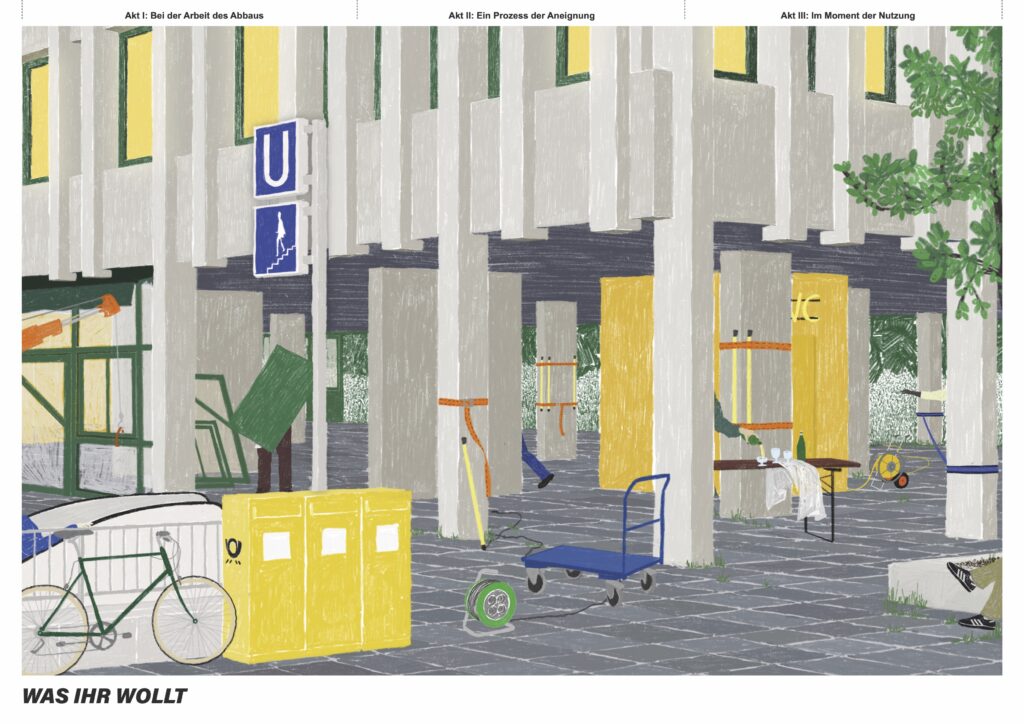 In einer Videocollage beantworten Münchner*innen die Frage, welche Nutzungen sie sich für das Justizzentrum wünschen. Neben einer Vielzahl an Vorschlägen wird so ein partizipativer Planungsprozess skizziert, in dem die Zivilgesellschaft eingeladen wird, über die Zukunft des Gebäudes zu verhandeln.